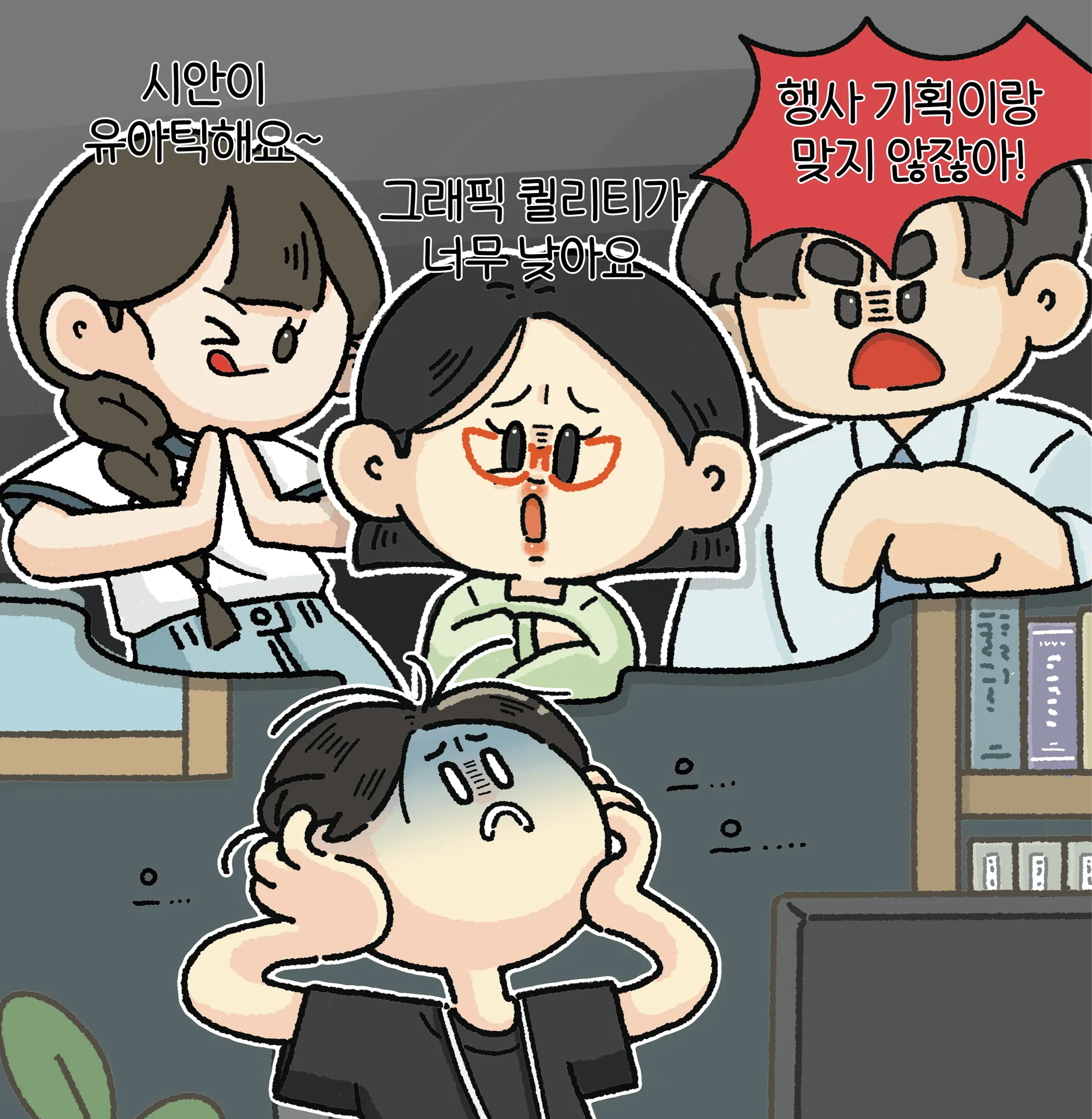 디자인하면서 어떤 순간이 가장 어려운가요? 시안을 기획하는 단계? 아니면 디자인 작업 과정? 물론 모든 과정이 힘들겠지만, 동글은 피드백 받는 순간이 가장 어려웠던거 같아요, 피드백을 받기 전 저의 상태는 숨이 거칠어 지고 심장이 빨리 뛰고 다른 생각이 나지 않을 정도로 멘탈이 나가 있는 상태였거든요. 심지어 피드백 받는 순간을 떠올리다보면 “이렇게 컬러를 쓰면 수정하라고 하시지 않을까?” “이런 타이틀 디자인은 별로다라고 하시지 않을까?” 등의 생각을 거치다 보면 나의 작업물에 대한 확신도 줄어들기 시작하더구요. 이후에는 이렇게 가져가도 수정하라고 하시겠지?