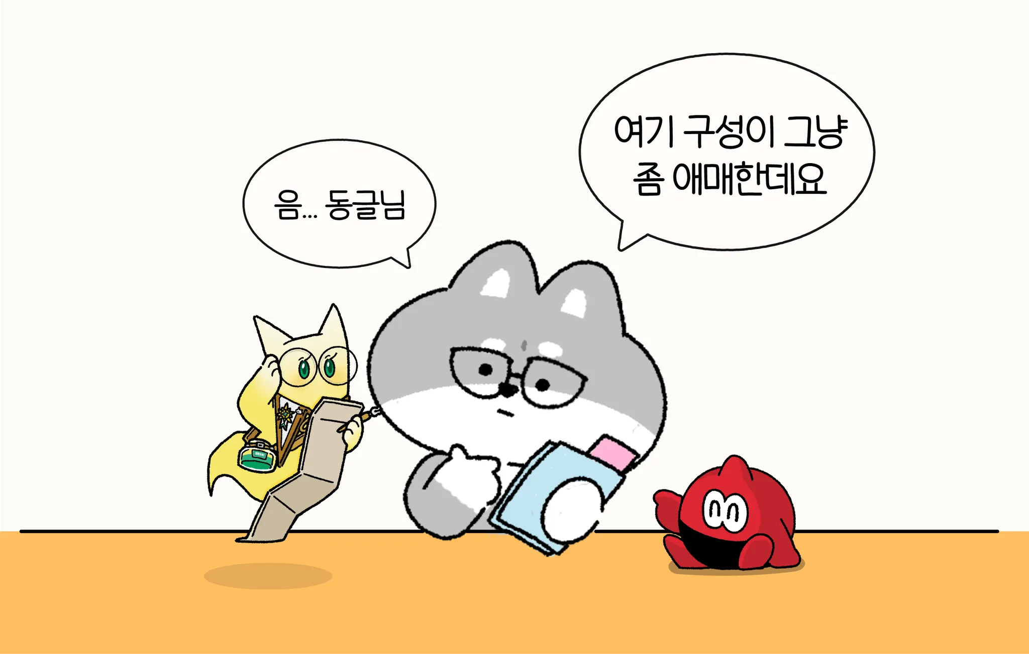 동글도 처음엔 “시키는 대로, 하라는 대로”만 수정했었답니다. 하지만 그렇게 만든 수정안을 가져갔을 때 대부분의 반응은 이랬어요. “이렇게 말한게 아닌데?” “음... 전 게 더 나았던 것 같아요.”